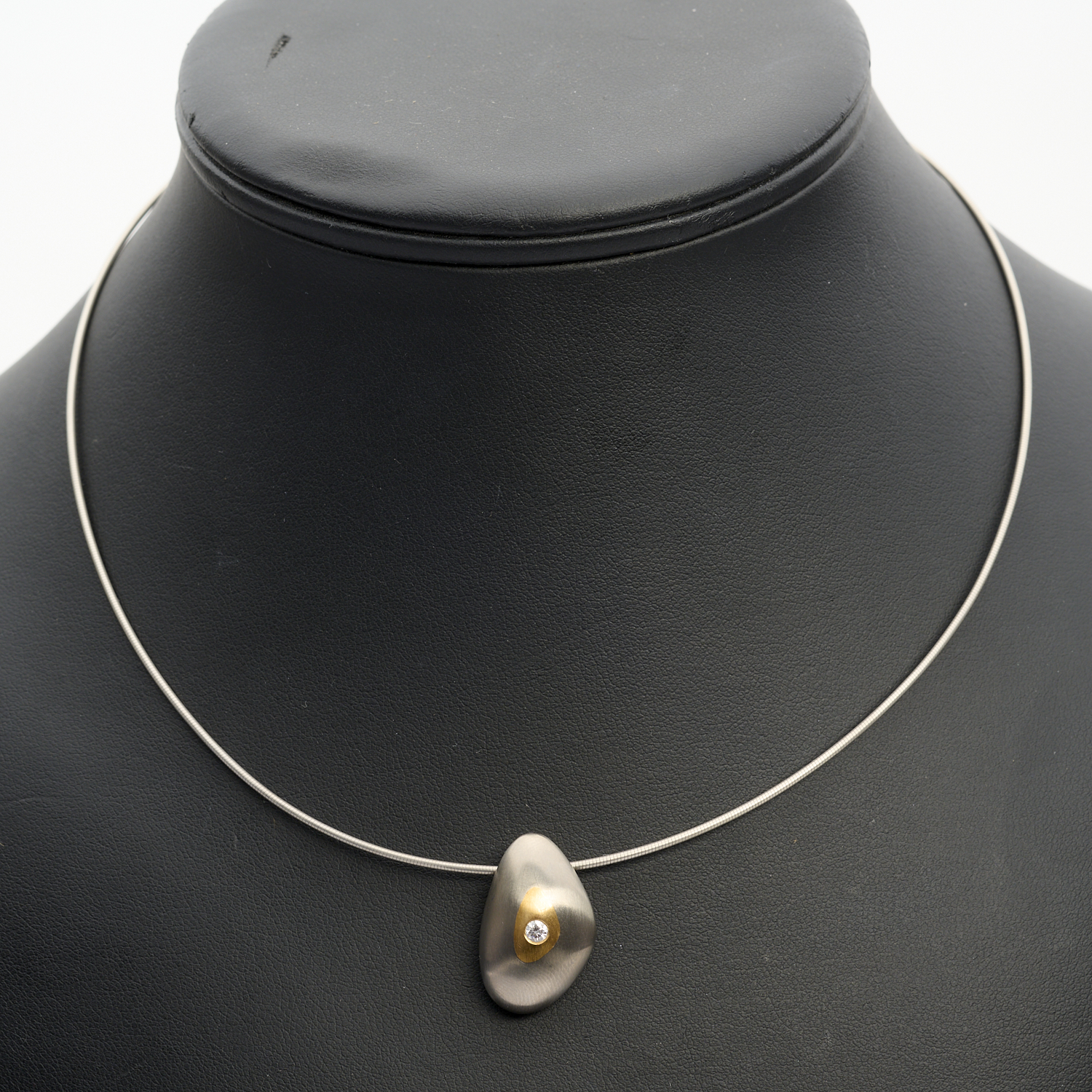 A DIAMOND SET TWO TONE PENDANT IN 18CT GOLD AND TITANIUM TO A FLEXIBLE WIRE, PENDANT APPROXIMATELY 22MM X 14MM, WIRE LENGTH APPROXIMATELY 420MM