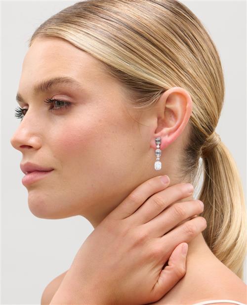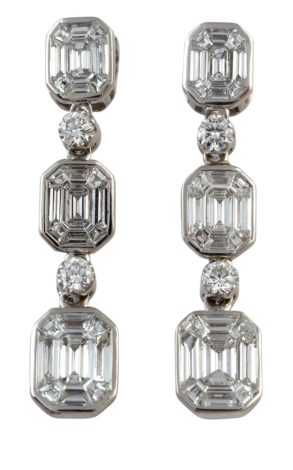 Each octagon-shaped surmount designed as a cluster of calibré-cut diamonds supporting a similarly set line of clusters between claw-set diamond connectors, the diamonds together weighing approximately 2.60 carats, mounted in 18ct white gold, length 20mm, post fittings.