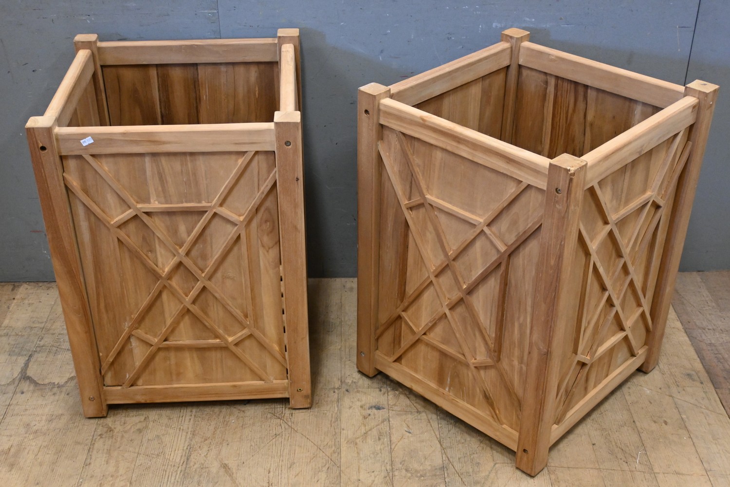 A PAIR OF TEAK PLANTERS ( 71H X 50W X 50D CM) (A/F) (LEONARD JOEL DELIVERY SIZE: LARGE)