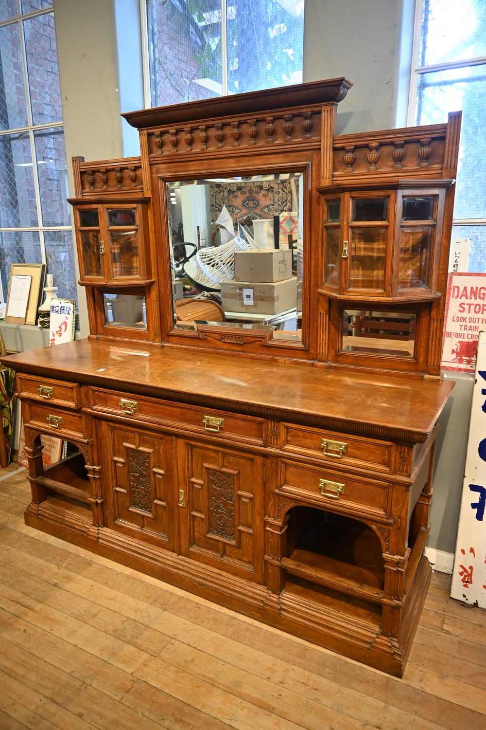 A SUBSTANTIAL OAK DOUBLE BODIED EDWARDIAN SIDEBOARD WITH MIRRORED BACK (230H X 214W X 65D CM) (PLEASE NOTE THIS HEAVY ITEM MUST BE REMOVED BY CARRIERS AT THE CUSTOMER'S EXPENSE. LEONARD JOEL STAFF CANNOT ASSIST CARRYING THIS ITEM) (X-LARGE ITEM)