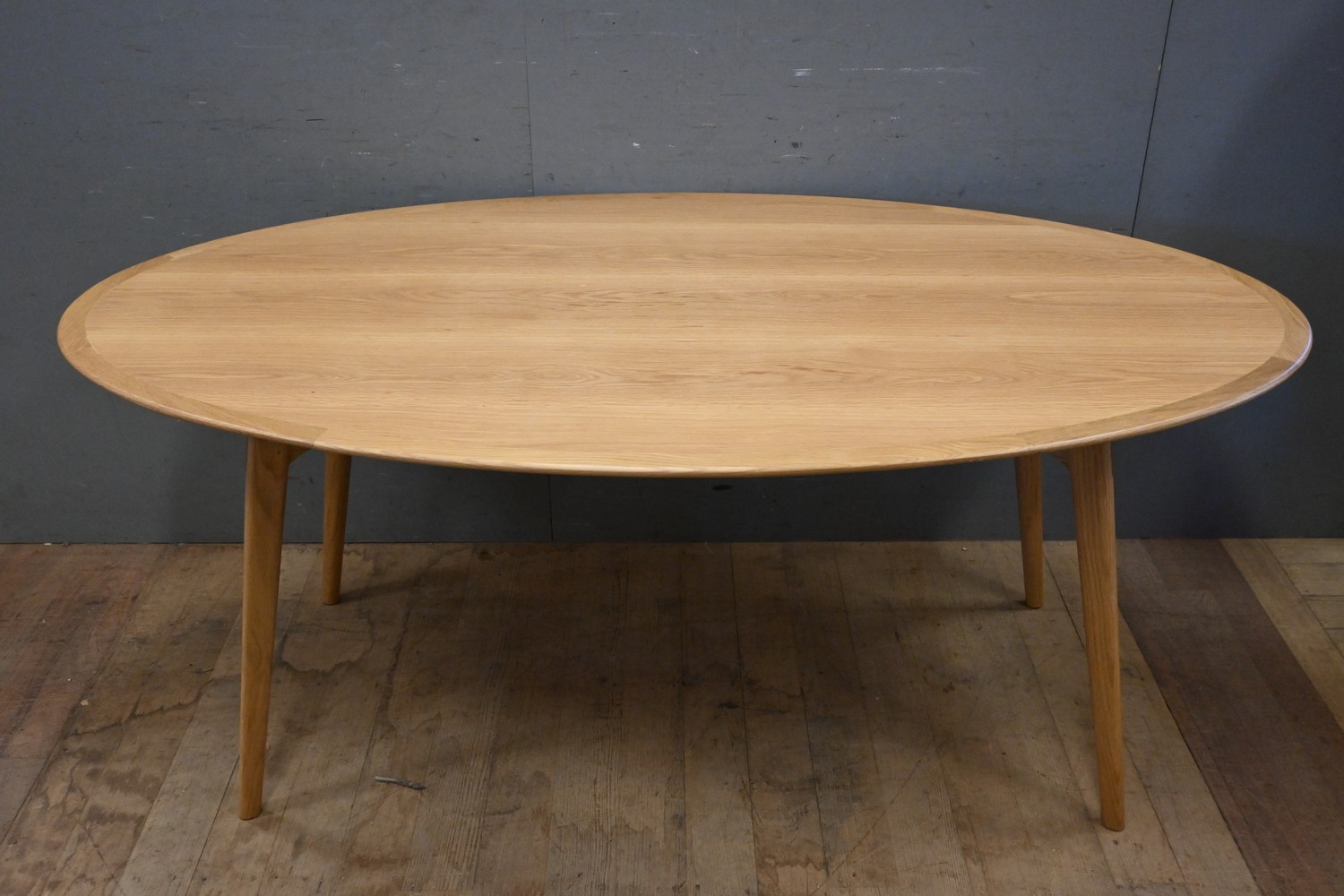 A MID CENTURY STYLE OAK OVAL DINING TABLE (76H X 184W X 100D CM) (PLEASE NOTE THIS HEAVY ITEM MUST BE REMOVED BY CARRIERS AT THE CUSTOMER'S EXPENSE. LEONARD JOEL STAFF CANNOT ASSIST CARRYING THIS ITEM) (X-LARGE ITEM)