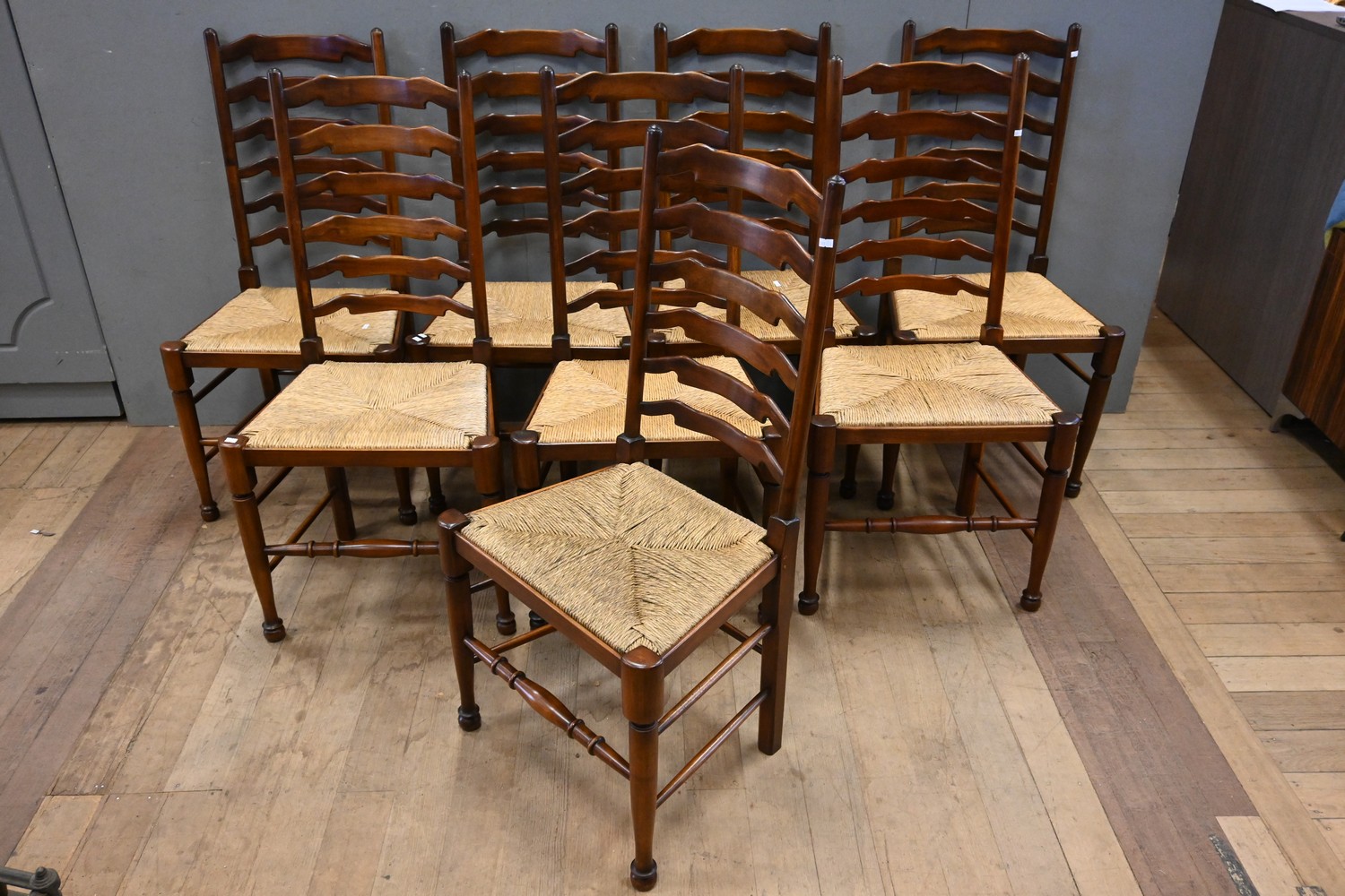 A SET OF EIGHT ENGLISH LADDERBACK DINING CHAIRS WITH RUSH SEATING (110H X 56W X 41D CM) (LEONARD JOEL DELIVERY SIZE: LARGE)