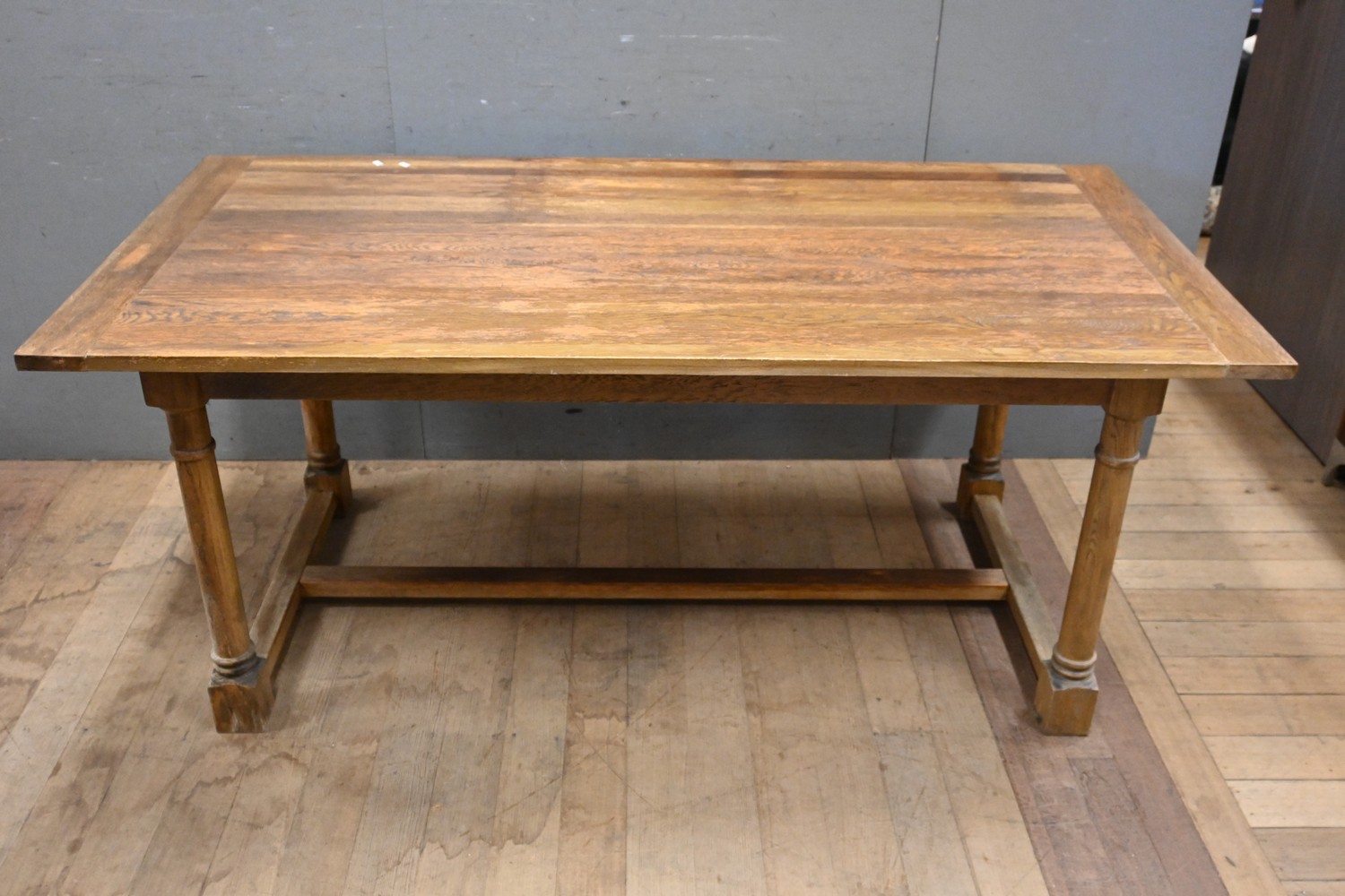 AN OAK STRETCHER BASE DINING TABLE (A/F) (77H X 180W X 90D CM) (PLEASE NOTE THIS HEAVY ITEM MUST BE REMOVED BY CARRIERS AT THE CUSTOMER'S EXPENSE. LEONARD JOEL STAFF CANNOT ASSIST CARRYING THIS ITEM) (X-LARGE ITEM)