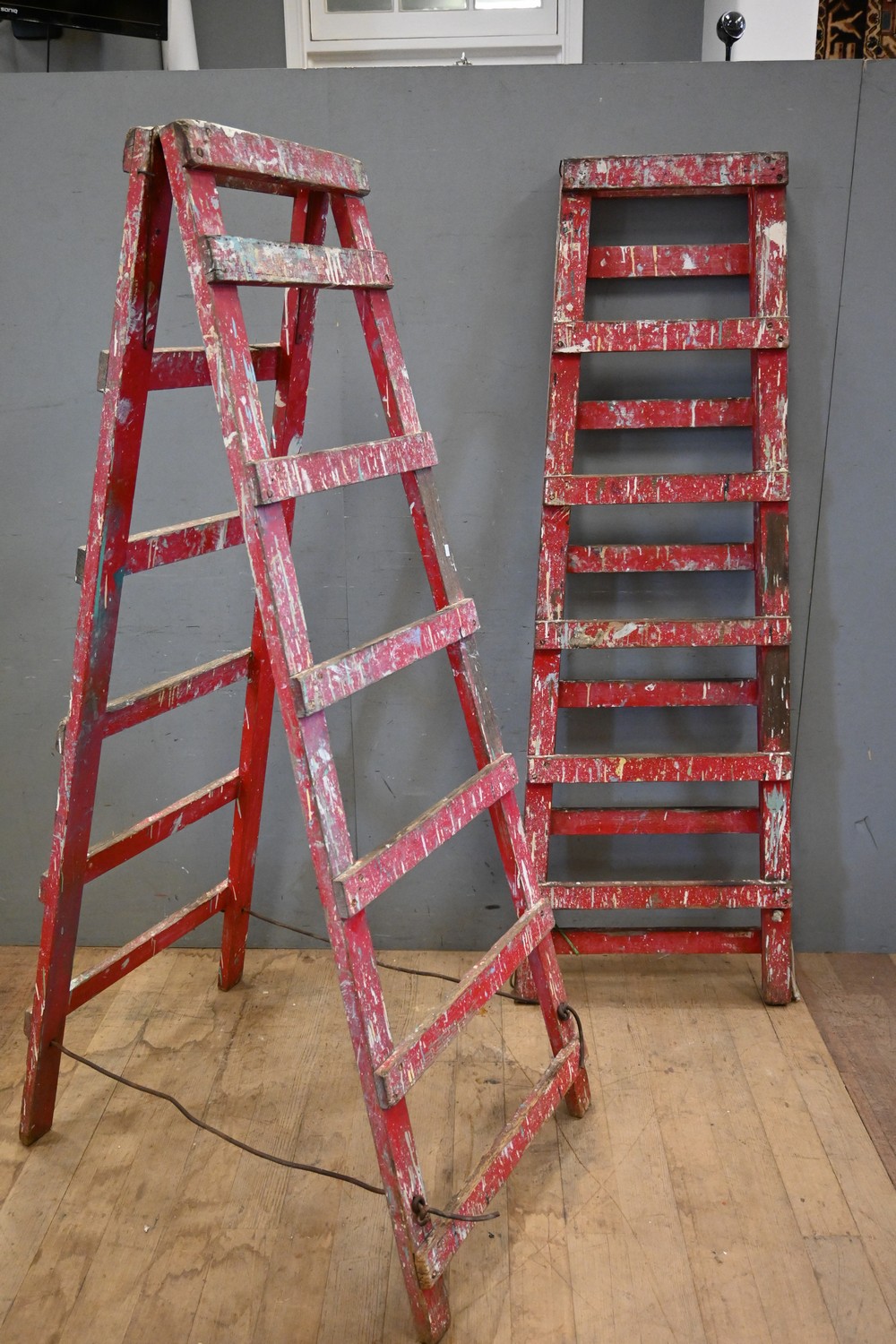 PAIR OF 1940S HEAVY HARDWOOD PAINTED RED WOODEN LADDERS (A/F) (THE LARGEST 192H X 67W, 98W CM FULLY EXTENDED) (PLEASE NOTE THIS HEAVY ITEM MUST BE REMOVED BY CARRIERS AT THE CUSTOMER'S EXPENSE. LEONARD JOEL STAFF CANNOT ASSIST CARRYING THIS ITEM) (X-LARGE ITEM)
