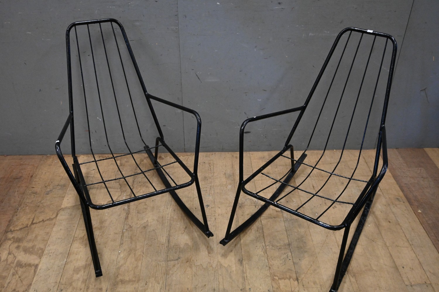 PAIR OF MID CENTURY 1950S BLACK STEEL AUSTRALIAN MADE ROCKING CHAIRS (81H X 56W X 80D CM) (LEONARD JOEL DELIVERY SIZE: LARGE)