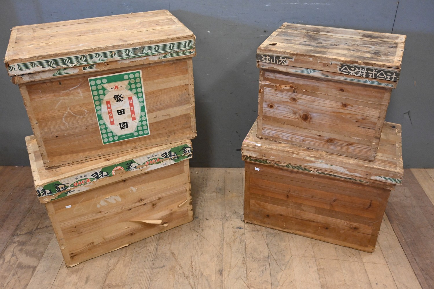 COLLECTION OF FOUR VINTAGE JAPANESE PINE LIDDED TEA CHESTS ( 50H X 67W X 43D CM) (A/F) (LEONARD JOEL DELIVERY SIZE: LARGE)