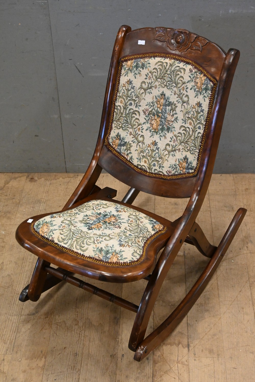 AN ENGLISH MAHOGANY TAPESTRY UPHOLSTERED FOLDING ROCKING CHAIR (A/F) (79H X 46W X 75D CM) (LEONARD JOEL DELIVERY SIZE: LARGE)