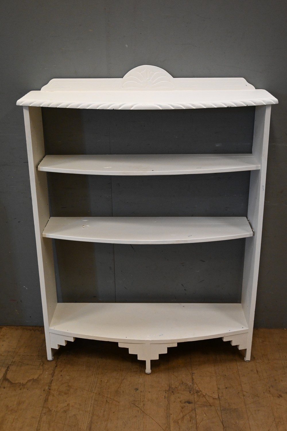 A 1940S PAINTED WHITE ENGLISH OAK ART DECO FOUR TIER BOOKSHELF (A/F) ( 132H X 100W X 32D CM) (LEONARD JOEL DELIVERY SIZE: LARGE)