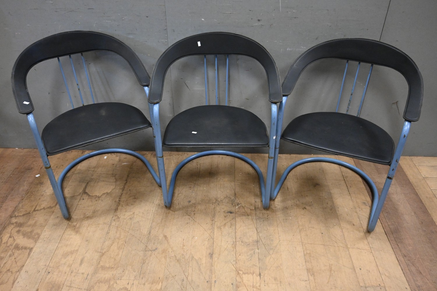 A SET OF THREE 1970S ITALIAN BLUE STEEL FRAMED AND LEATHER SEATED AND BACKED ARMCHAIRS (A/F) (H81 X W60 X D51 CM) (LEONARD JOEL DELIVERY SIZE: LARGE)