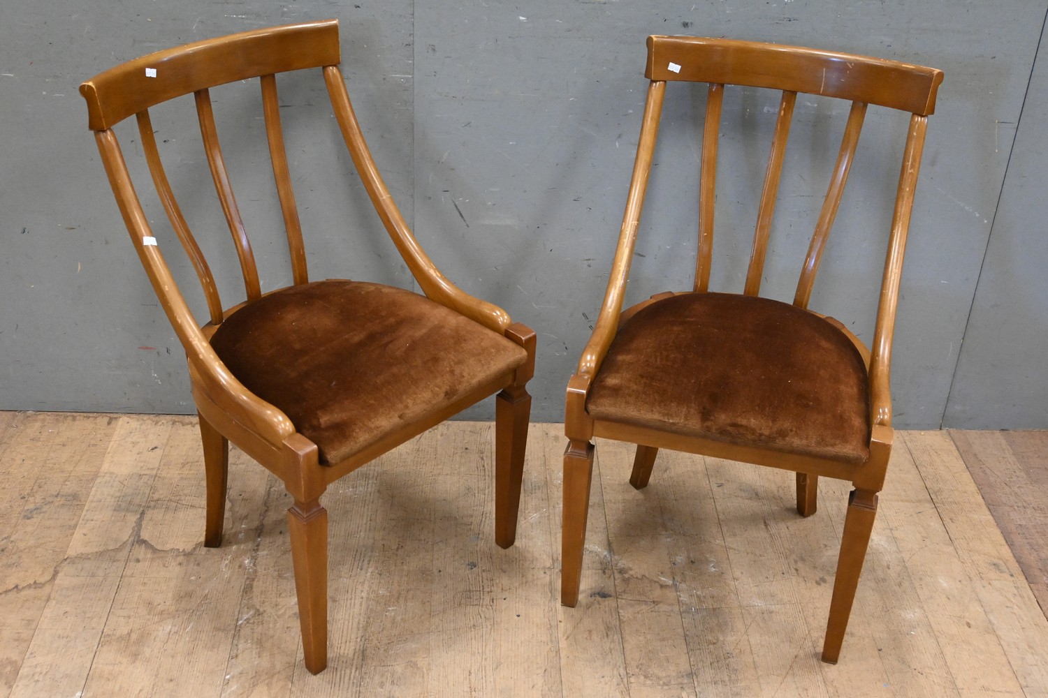 A PAIR OF ENGLISH MADE WALNUT BROWN SEATED CARVER CHAIRS (A/F) (86 H X 49 W X 50 CM D) (LEONARD JOEL DELIVERY SIZE: LARGE)