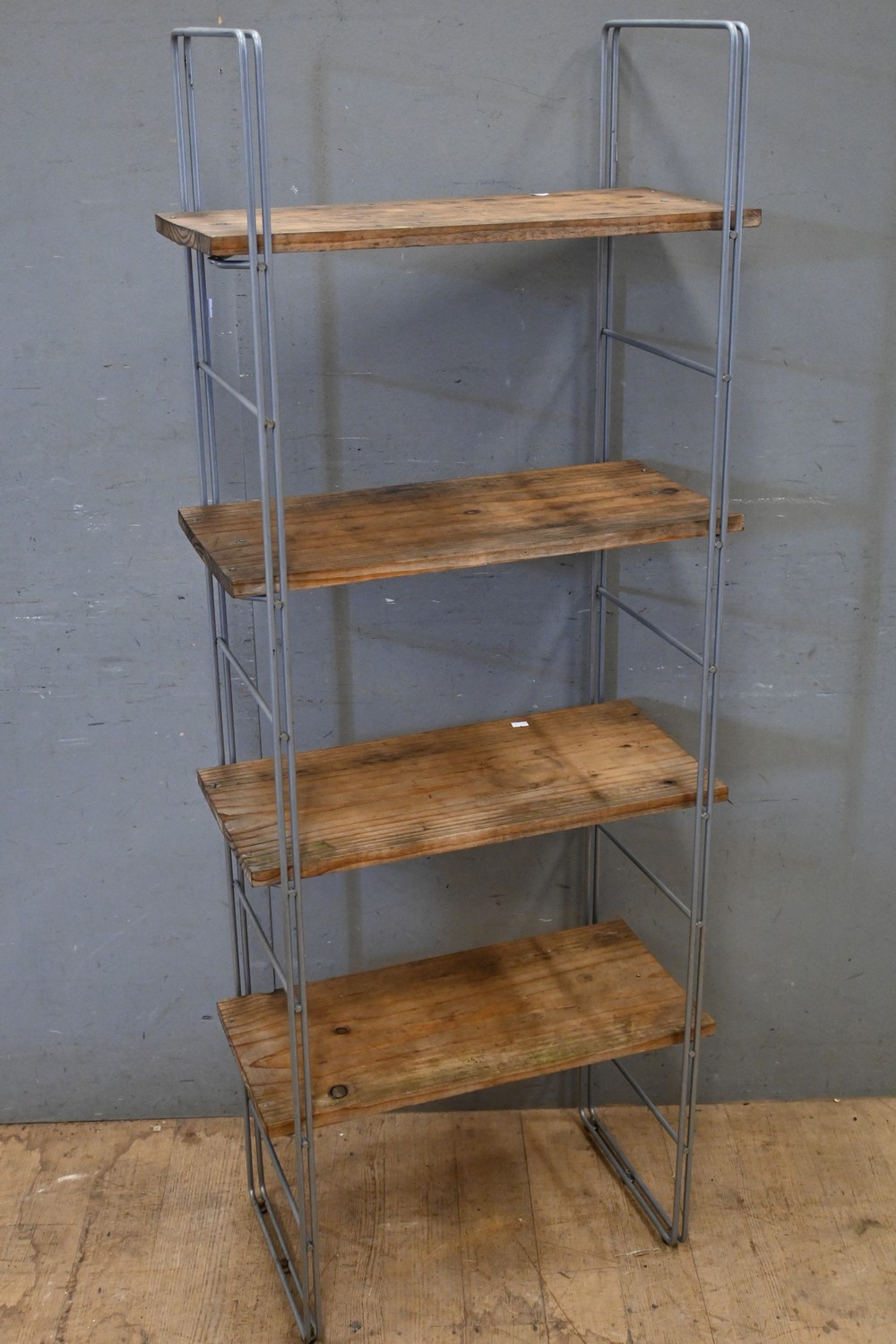 A CONTEMPORARY WOODEN AND METAL FOUR TIER DISPLAY STAND (A/F) ( 159H X 62W X 33D CM) (LEONARD JOEL DELIVERY SIZE: LARGE)