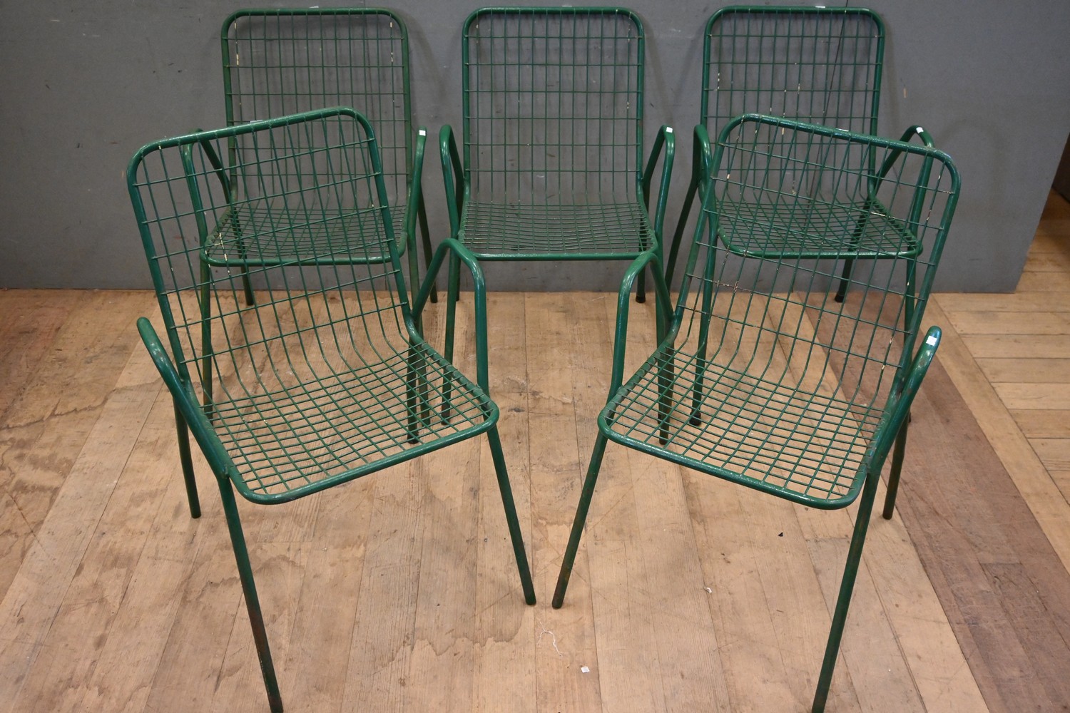 SET OF FIVE VINTAGE MID CENTURY 1950S GREEN WIRE FRAMED STACKING PATIO ARM CHAIRS (A/F) (78H X 55W X 54D CM) (LEONARD JOEL DELIVERY SIZE: LARGE)