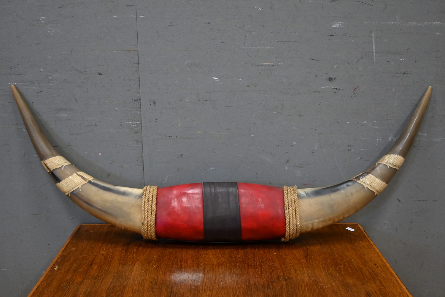 A PAIR OF CHINESE CARVED BUFFALO HORNS WITH DRAGON MOTIFS (W105 CM) (LEONARD JOEL DELIVERY SIZE: MEDIUM)
