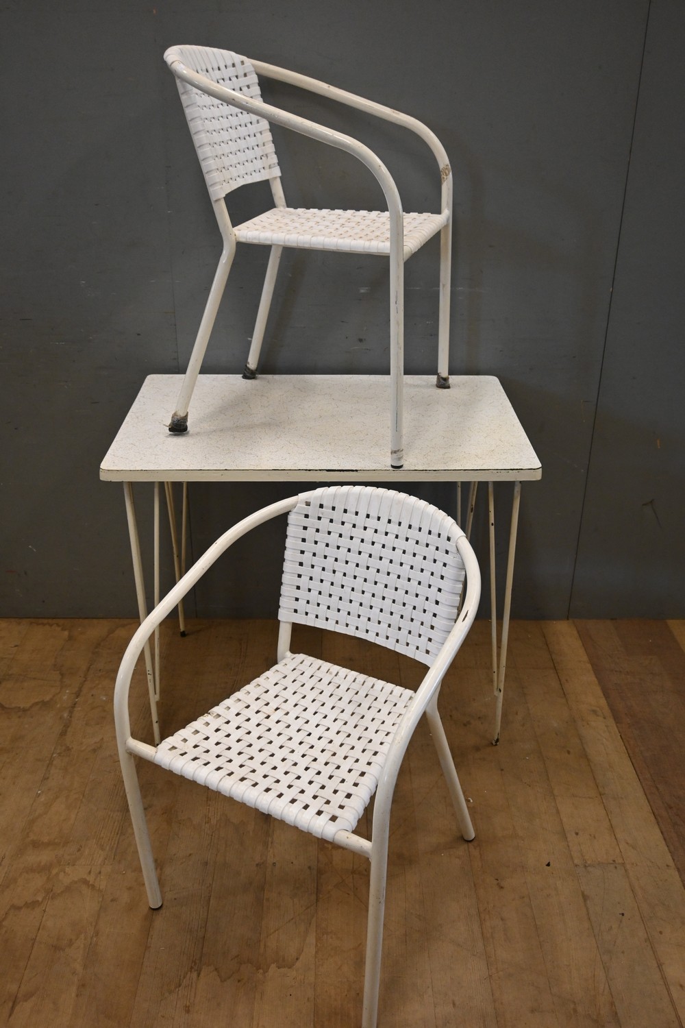 1950S MID CENTURY METAL FRAMED RECTANGULAR LAMINEX TOPPED TABLE AND 2 METAL FRAMED CHAIRS WITH WOVEN SEATS (76H X 90W X 59D CM) (LEONARD JOEL DELIVERY SIZE: LARGE)