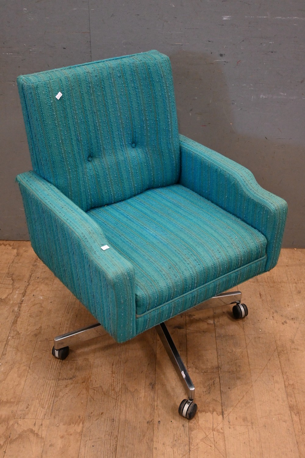 1960S AUSTRALIAN MADE PARGUE FURNITURE ORIGINAL SWIVEL TURQUOISE WOOLEN UPHOLSTERED OFFICE CHAIR WITH TILT BACK MECHANISM (81H X 64W X 65H CM) (LEONARD JOEL DELIVERY SIZE: LARGE)