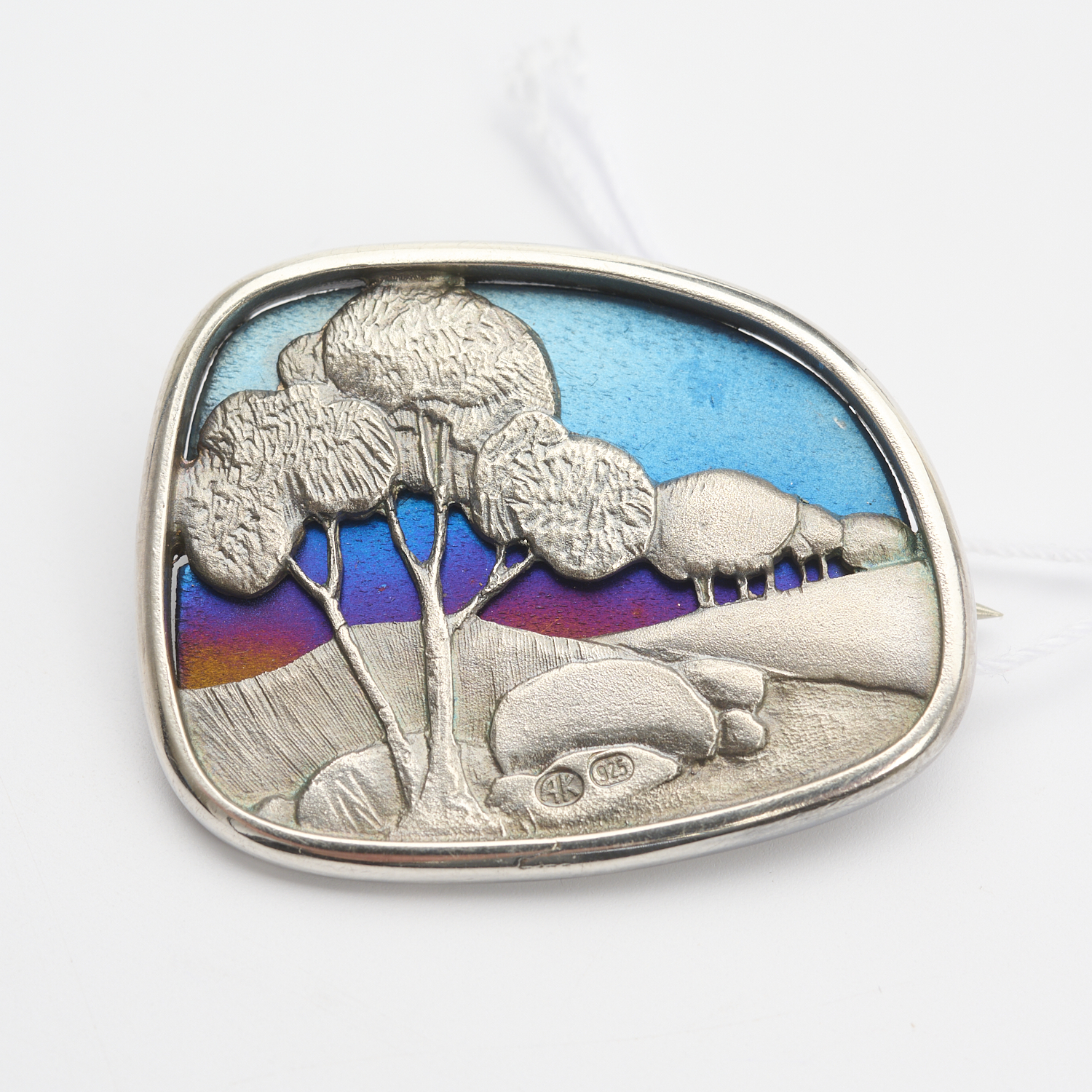 A ''LANDSCAPE'' BROOCH IN STERLING SILVER AND TITANIUM BY TONY KEAN, APPROXIMATELY 35MM X 30MM, 10.2GMS