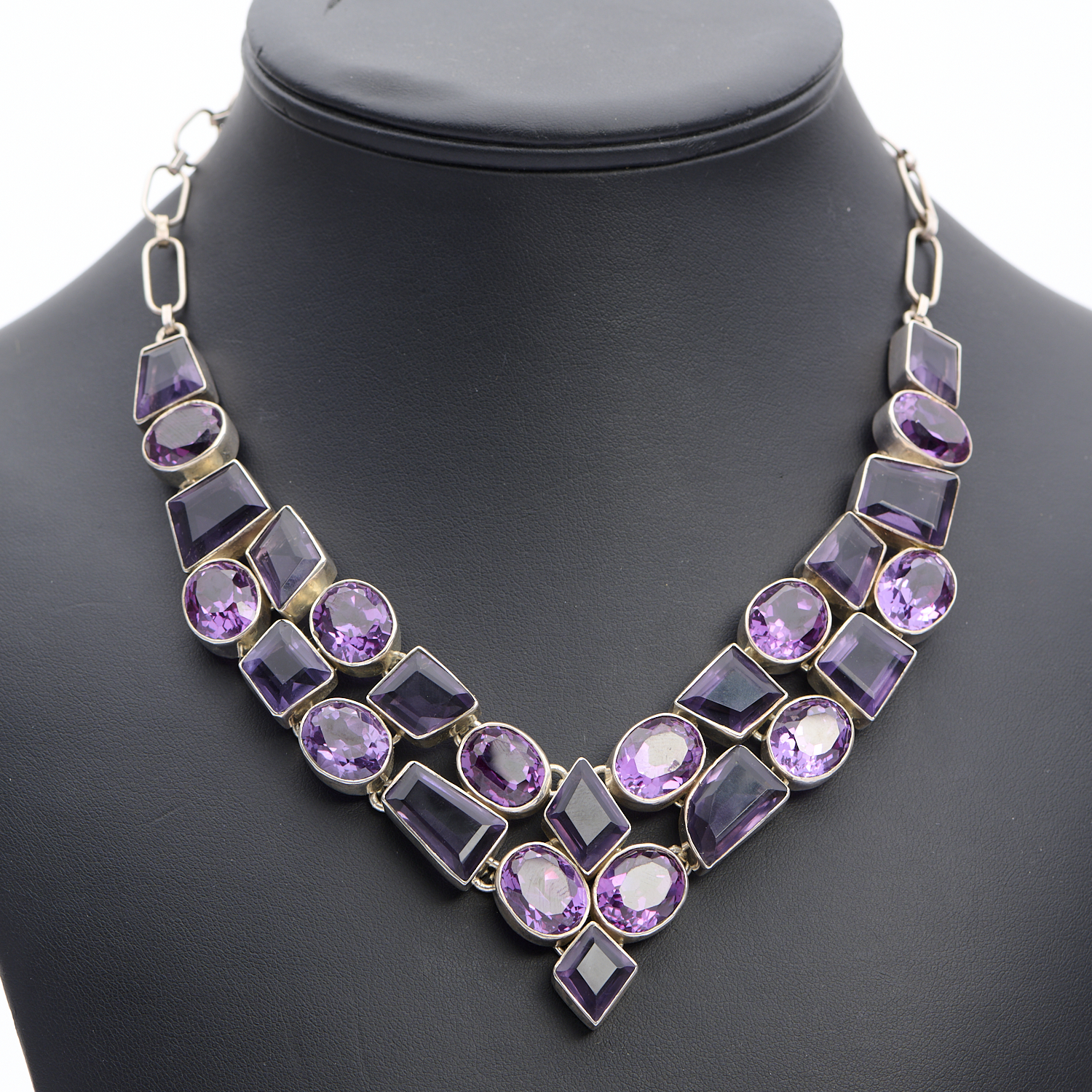 AN AMETHYST SET NECKLACE IN STERLING SILVER, TO A TOGGLE CLASP, TOTAL LENGTH APPROXIMATELY 440MM