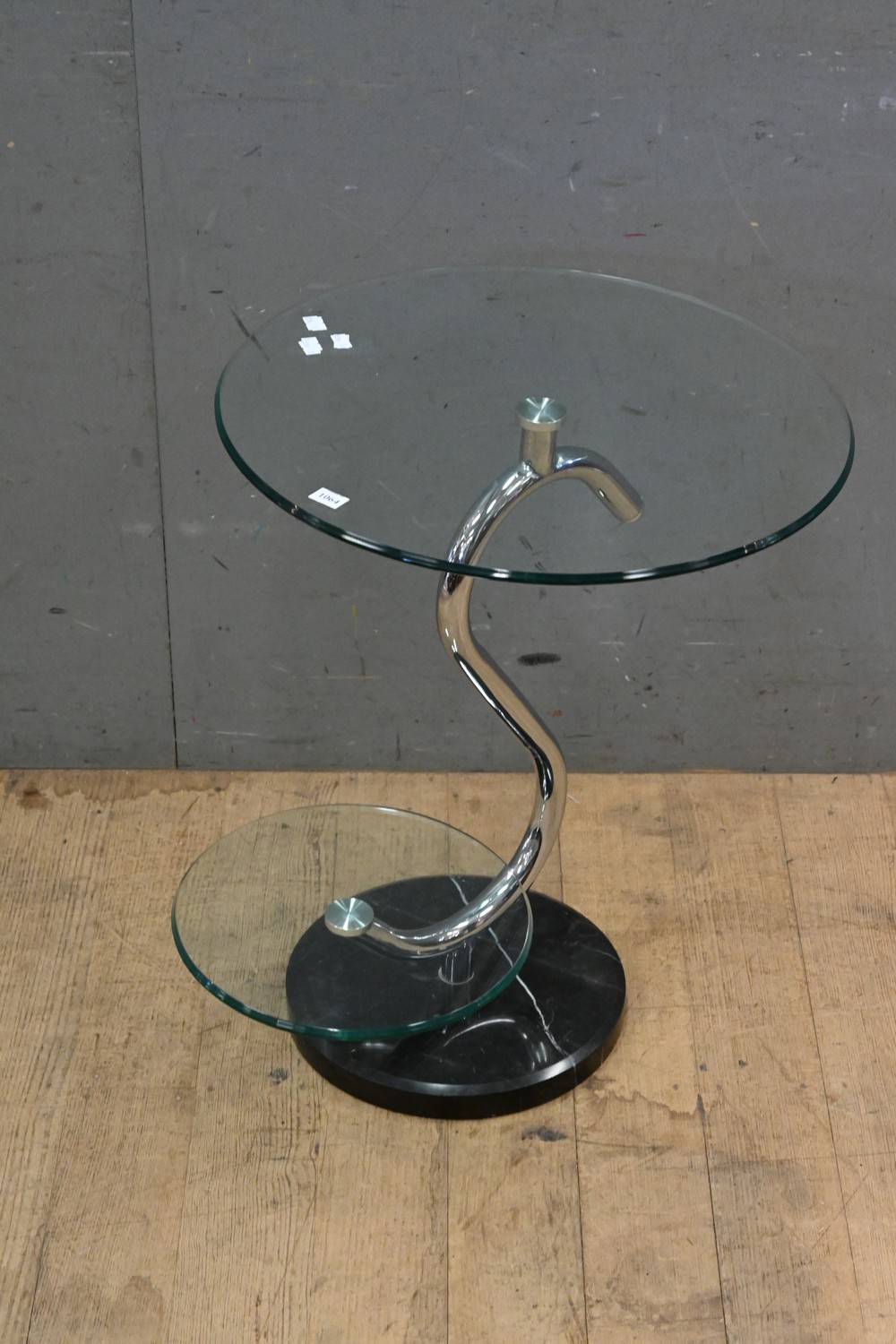 A CONTEMPORARY GLASS AND CHROME TABLE WITH MARBLE BASE (57H X 50 DIAMETER CM) (LEONARD JOEL DELIVERY SIZE: LARGE)