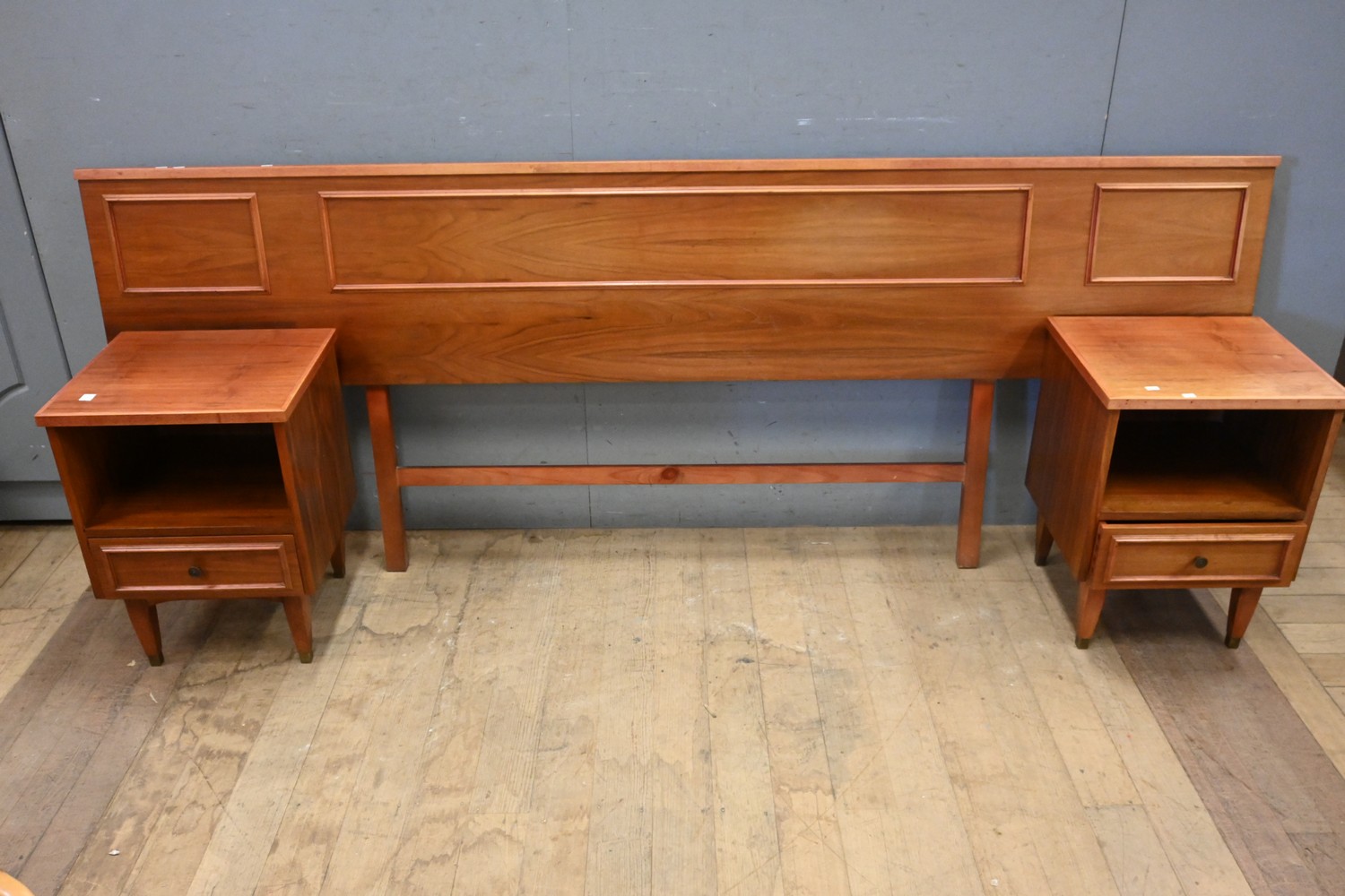 A MID CENTURY BEDHEAD AND TWO BEDSIDES (A/F) (BEDHEAD 93 H X 245 W X 10 D CM) (LEONARD JOEL DELIVERY SIZE: LARGE)
