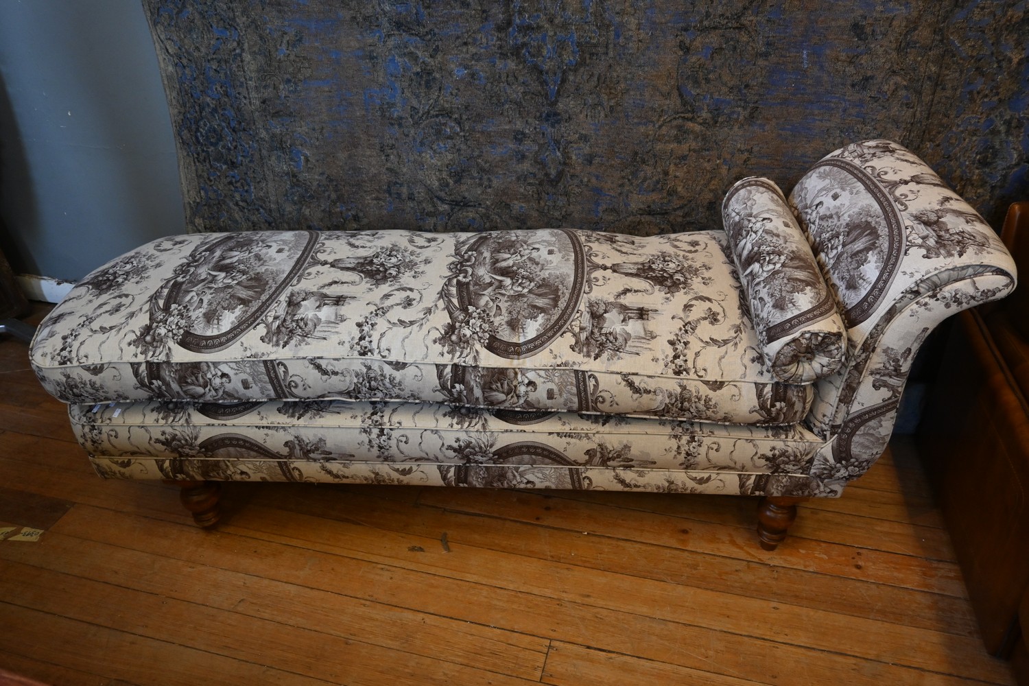 A FRENCH LINEN AND FEATHERDOWN CHAISE LOUNGE (86H X 206W X 66D CM) (PLEASE NOTE THIS HEAVY ITEM MUST BE REMOVED BY CARRIERS AT THE CUSTOMER'S EXPENSE. LEONARD JOEL STAFF CANNOT ASSIST CARRYING THIS ITEM) (X-LARGE ITEM)