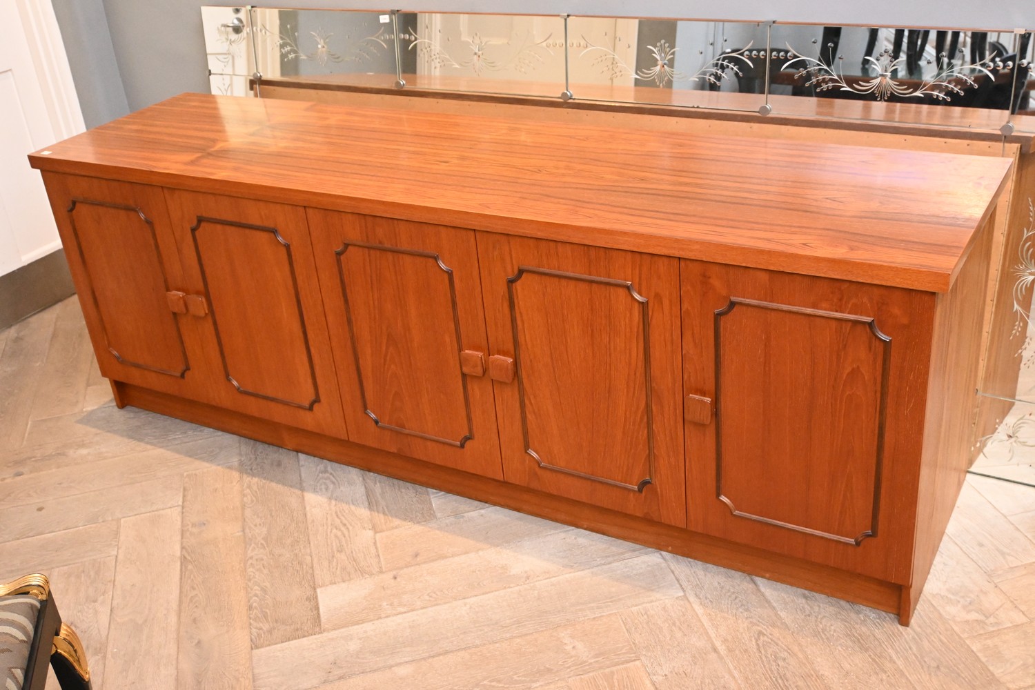 A MID CENTURY STYLE TEAK VENEER SIDEBOARD (79H X 230W X 59D CM) (PLEASE NOTE THIS HEAVY ITEM MUST BE REMOVED BY CARRIERS AT THE CUSTOMER'S EXPENSE. LEONARD JOEL STAFF CANNOT ASSIST CARRYING THIS ITEM) (X-LARGE ITEM)