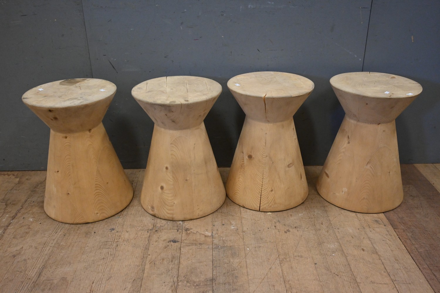 A SET OF FOUR SOLID TIMBER STOOLS (A/F) (42H X 32 DIA. CM) (LEONARD JOEL DELIVERY SIZE: LARGE)