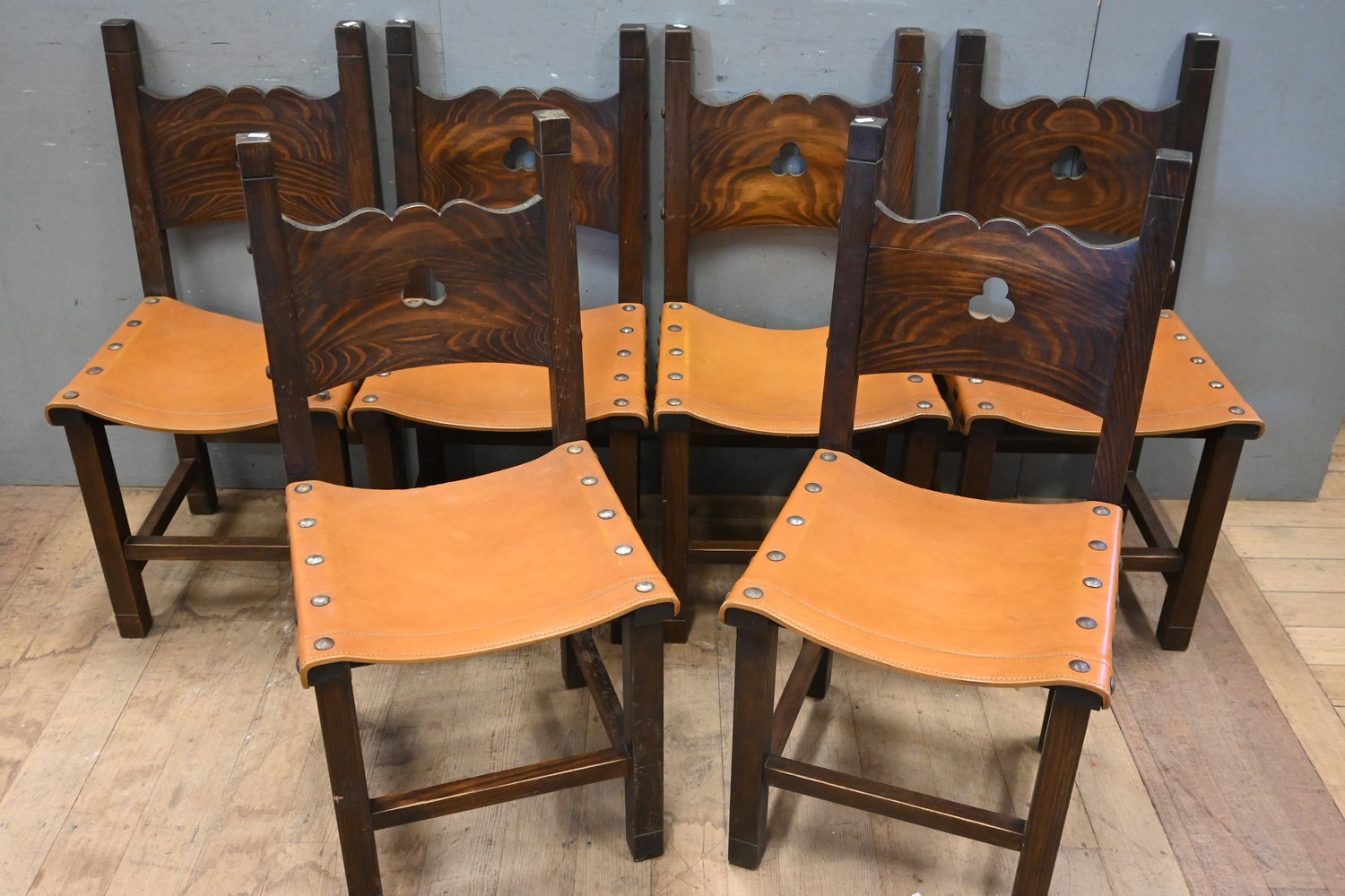 A SET OF SIX LEATHER AND TIMBER CHAIRS, (95H X 43W X 51D CM) (LEONARD JOEL DELIVERY SIZE: LARGE)