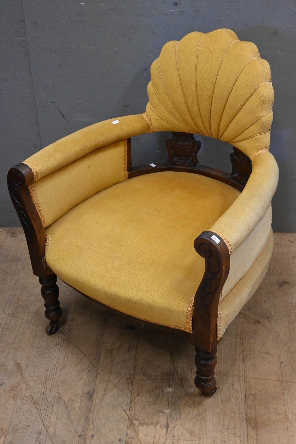 AN ANTIQUE CARVED TIMBER ARMCHAIR (A/F) ( 83H X 70W X 65D CM) (LEONARD JOEL DELIVERY SIZE: LARGE)