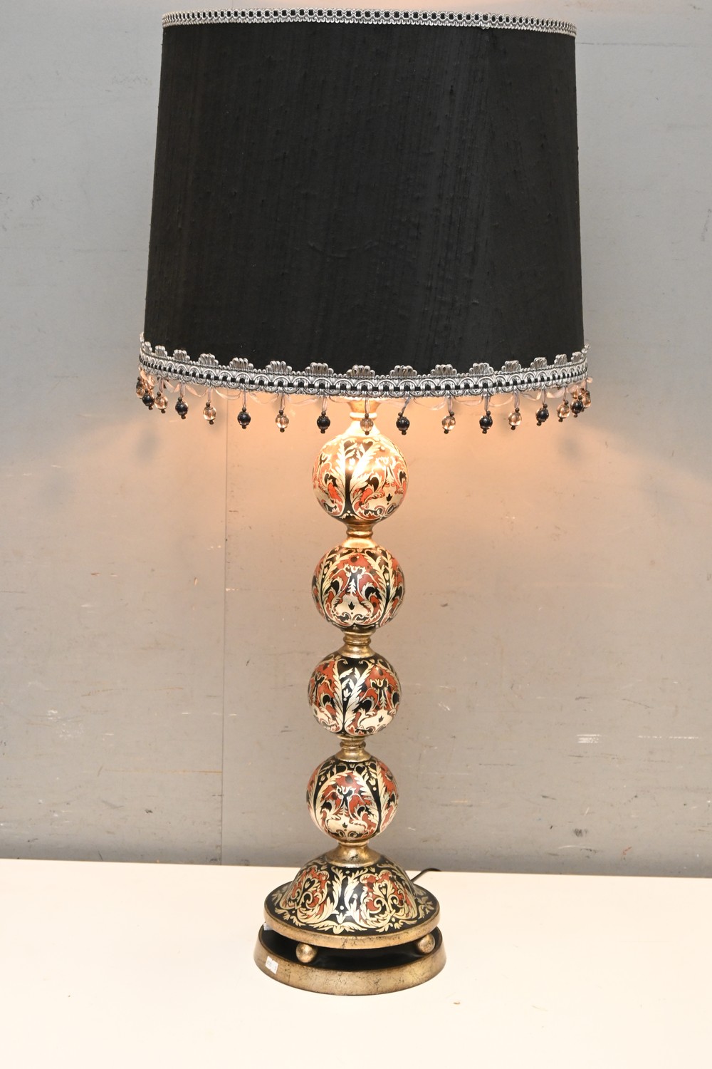 A DECORATIVELY HAND PAINTED BALL EFFECT TABLE LAMP WITH BLACK SILK SHADE (106H X 50D CM) (LEONARD JOEL DELIVERY SIZE: MEDIUM)
