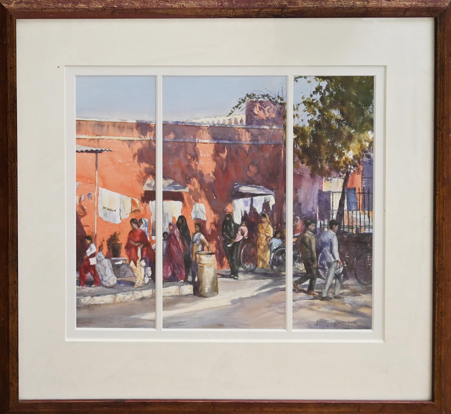 DONALD CAMERON, STREET SCENE JAIPUR (TRIPTYCH), WATERCOLOUR ON PAPER, 49 X 58CM