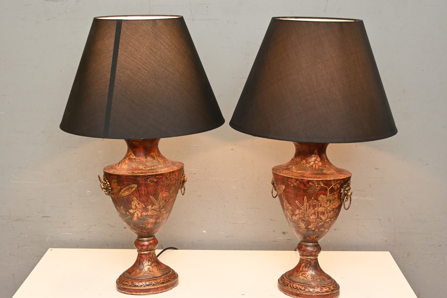A PAIR OF CHINOISERIE STYLE TABLE LAMPS WITH GILT HAND PAINTED DETAILING (82H CM) (LEONARD JOEL DELIVERY SIZE: LARGE)