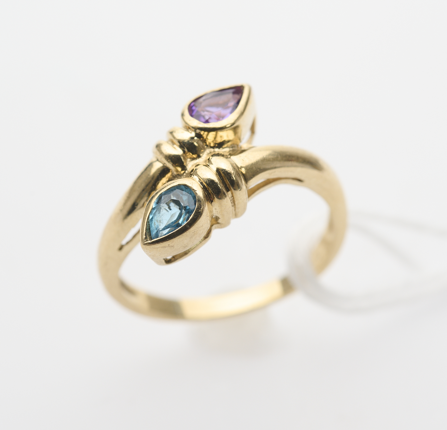 A PEAR CUT AMETHYST AND BLUE TOPAZ RING IN 9CT GOLD, RING SIZE F 1/2, 1.7GMS