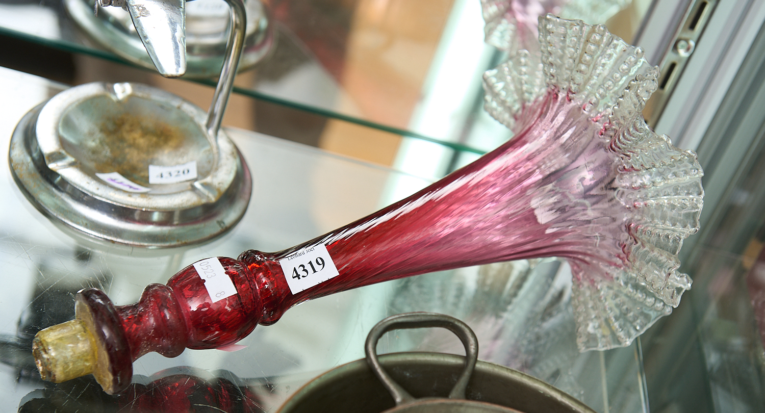 A RUBY GLASS EPERGNE TRUMPET (A/F) L.33CM, LEONARD JOEL LOCAL DELIVERY SIZE: SMALL