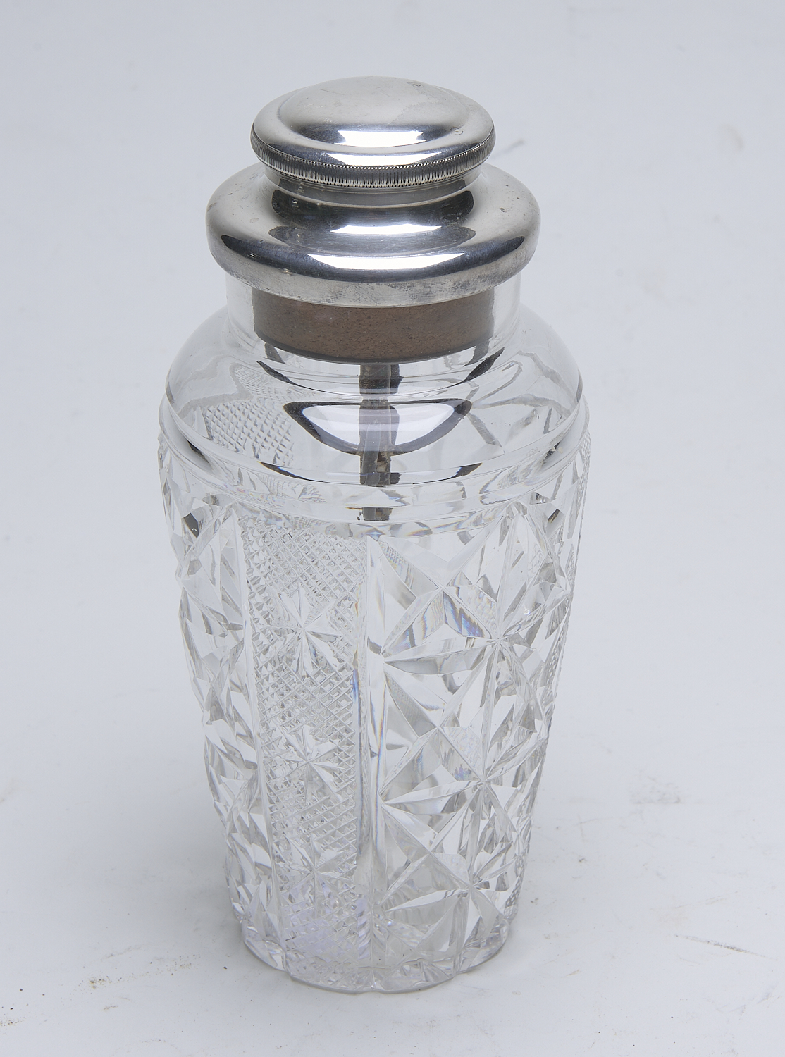 A CUT CRYSTAL COCKTAIL SHAKER WITH STERLING SILVER LID (A/F SEAL LOOSE) H.20CM, LEONARD JOEL LOCAL DELIVERY SIZE: SMALL