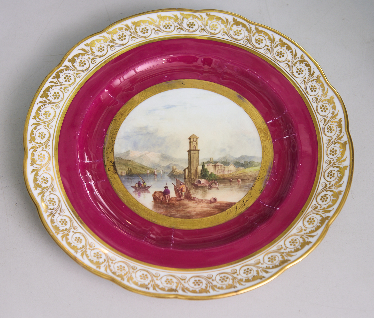 A HAND DECORATED PORCELAIN PLATE WITH SCENE DEPICTING LAKE COMO DIA.23.5CM, LEONARD JOEL LOCAL DELIVERY SIZE: SMALL