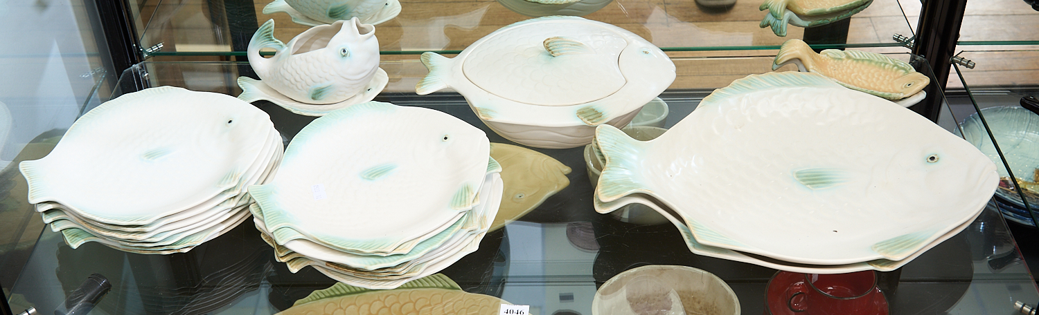 A GROUP OF SHORTER AND SON ENGLISH CHINA FISH FORM CERAMIC DINNERWARE, TUREEN (A/F), LEONARD JOEL LOCAL DELIVERY SIZE: MEDIUM