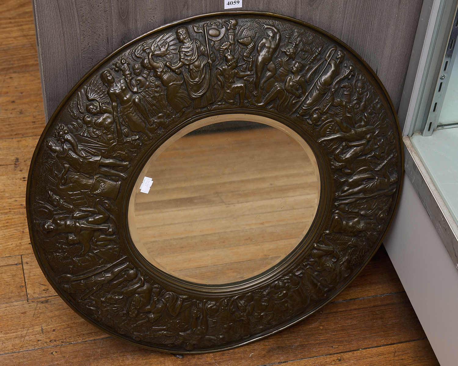 A FRENCH NEOCLASSICAL REPOUSSE BRASS MIRROR WITH ORIGINAL GLASS DIA.60CM, LEONARD JOEL LOCAL DELIVERY SIZE: MEDIUM