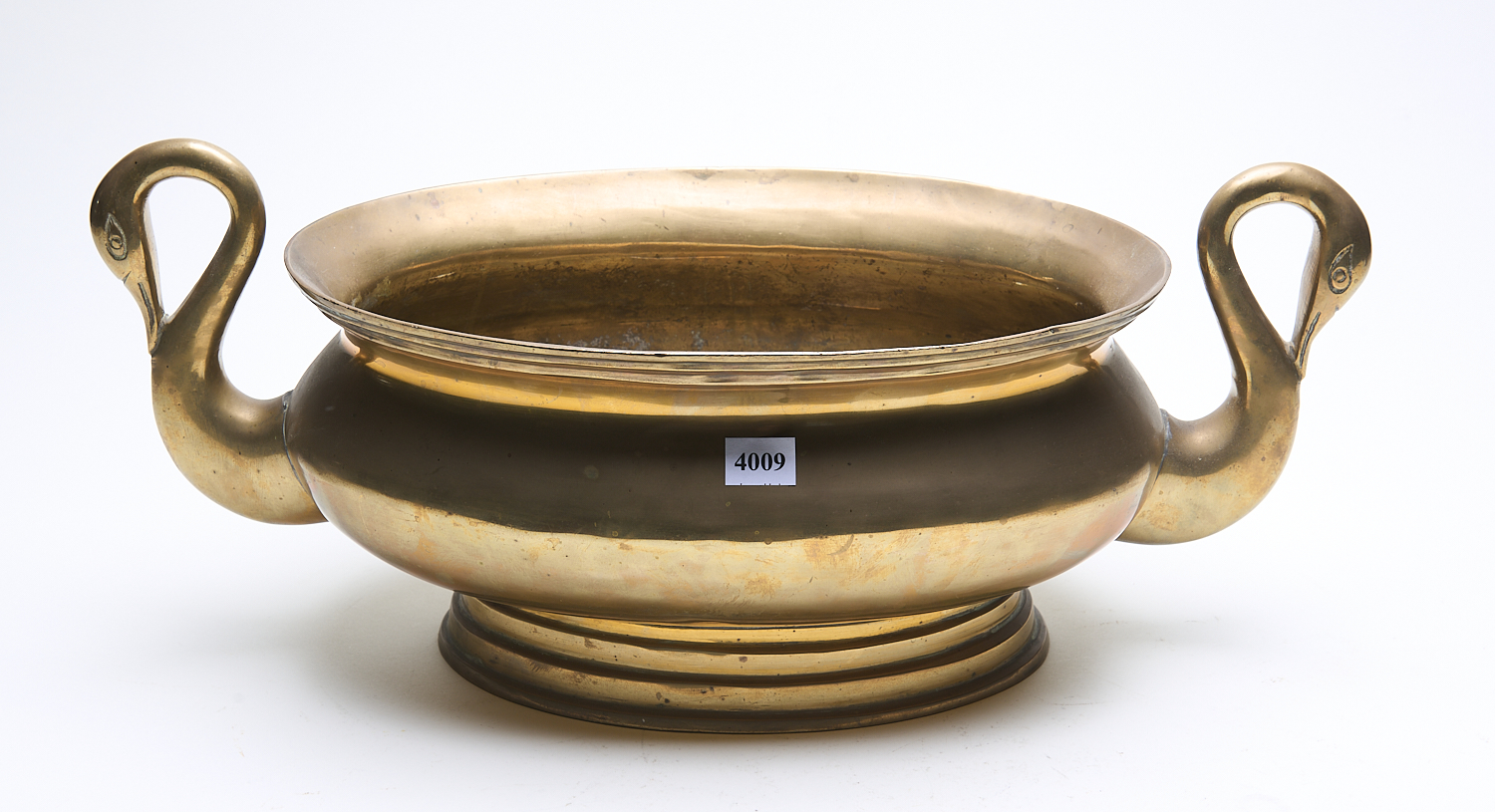 A FRENCH NAPOLEON III BRONZE SWAN JARDINIERE WITH RETAILERS STICKER TO BASE W.50CM, LEONARD JOEL LOCAL DELIVERY SIZE: MEDIUM