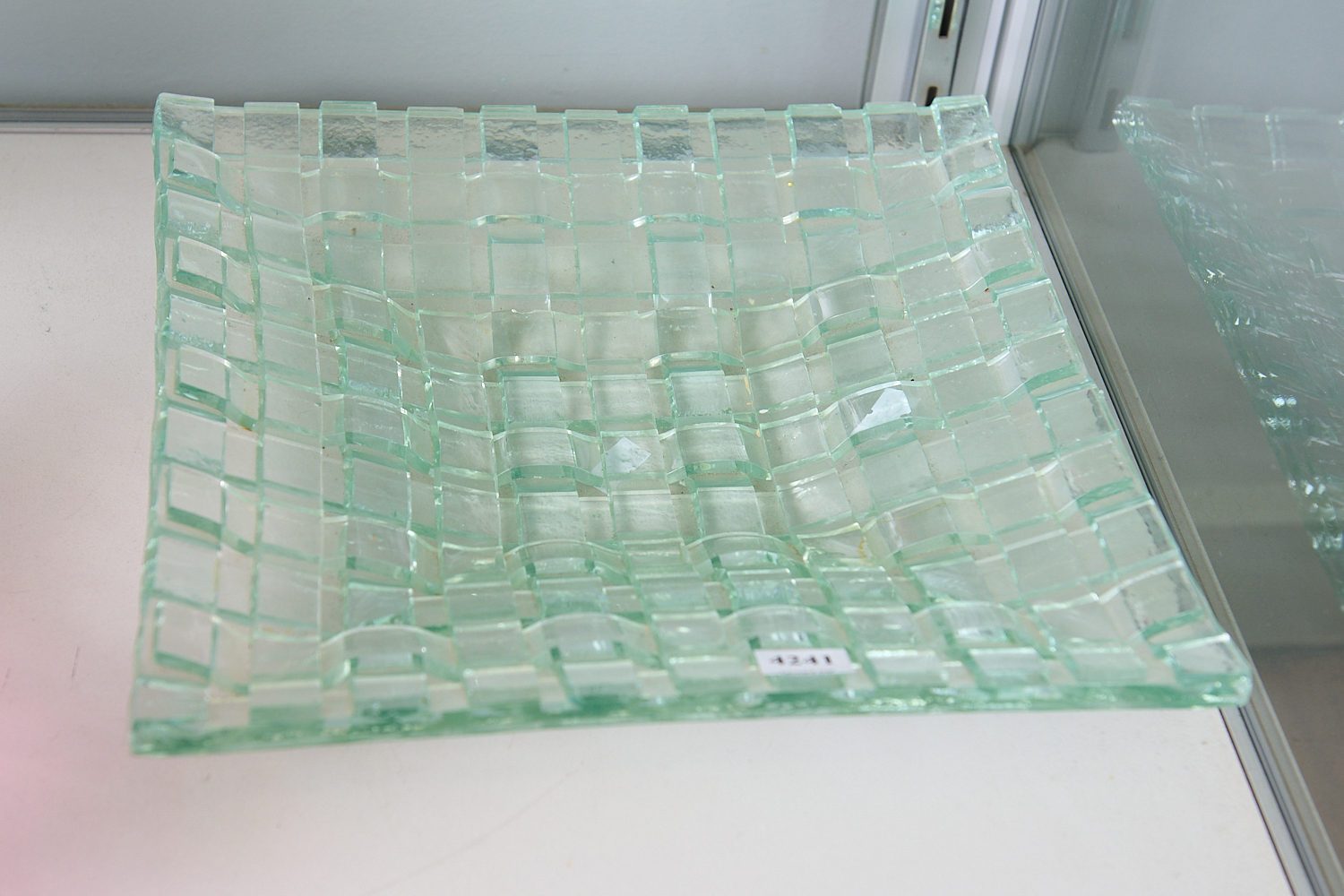 A SQUARE FORM WOVEN GLASS BOWL (A/F) W.29CM, LEONARD JOEL LOCAL DELIVERY SIZE: MEDIUM
