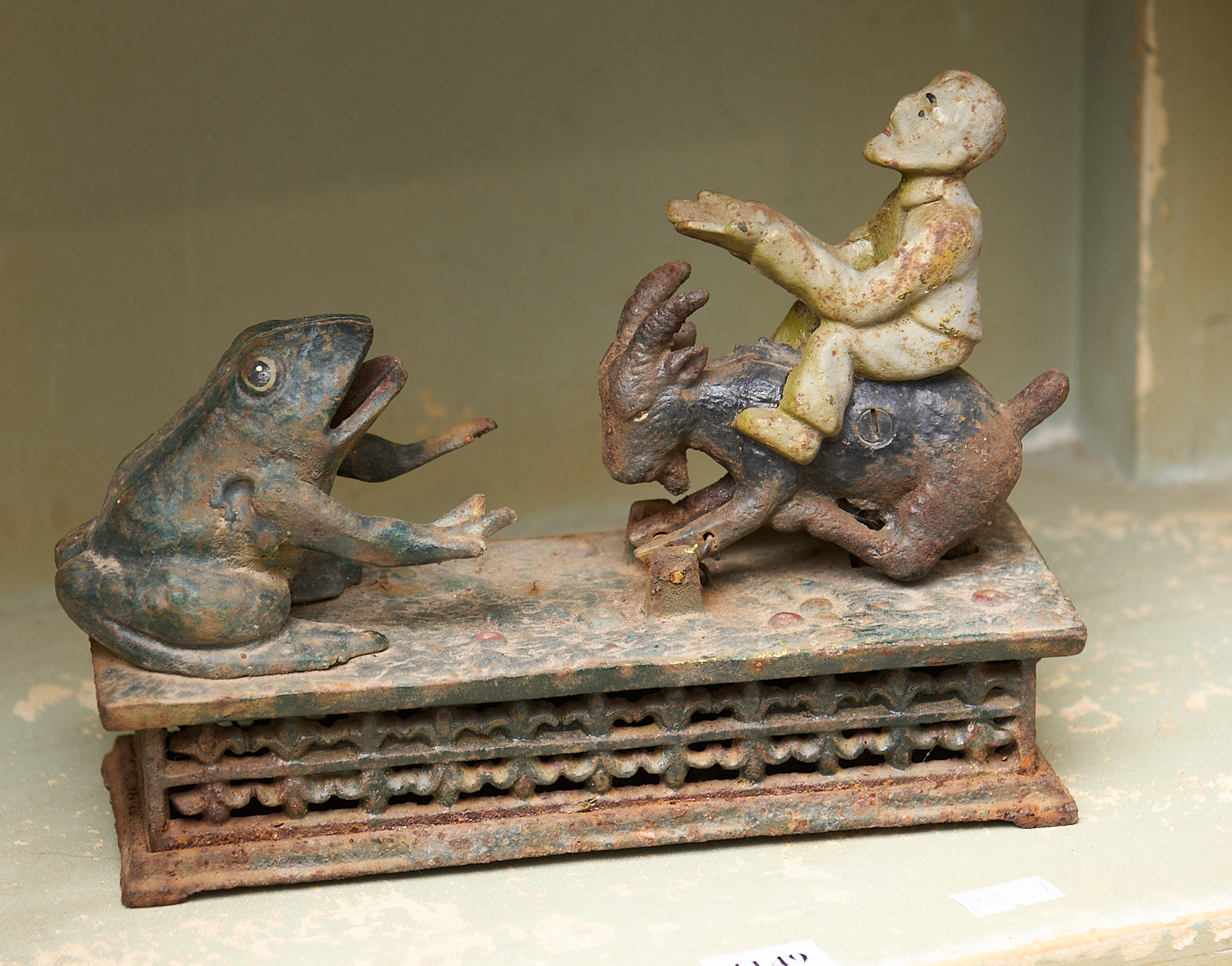A CAST IRON MONEY BOX - MAN ON GOAT WITH FROG W.23CM, LEONARD JOEL LOCAL DELIVERY SIZE: SMALL