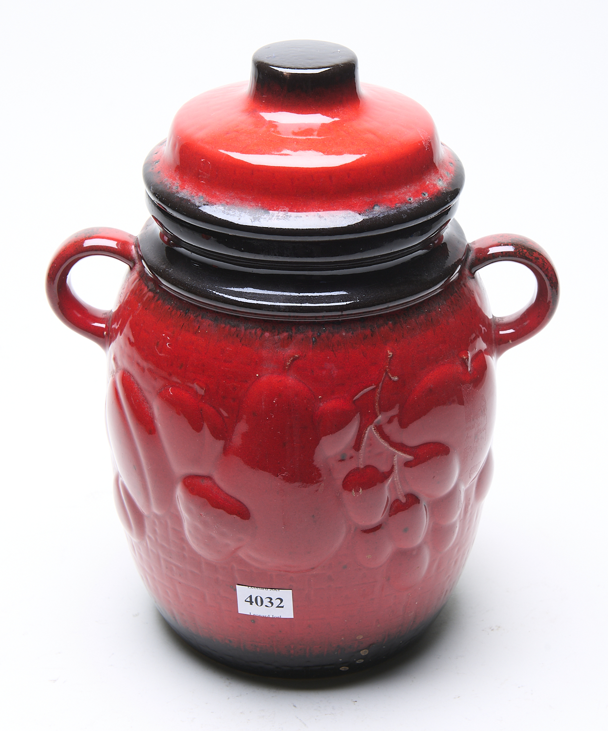 A WEST GERMAN LIDDED POT WITH FRUIT MOTIF H.28.5CM, LEONARD JOEL LOCAL DELIVERY SIZE: MEDIUM