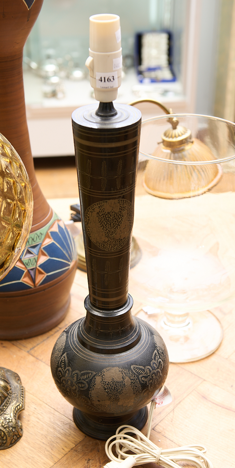 A TABLE LAMP WITH INCISED DECORATION TO METAL BASE H.59.5CM, LEONARD JOEL LOCAL DELIVERY SIZE: MEDIUM