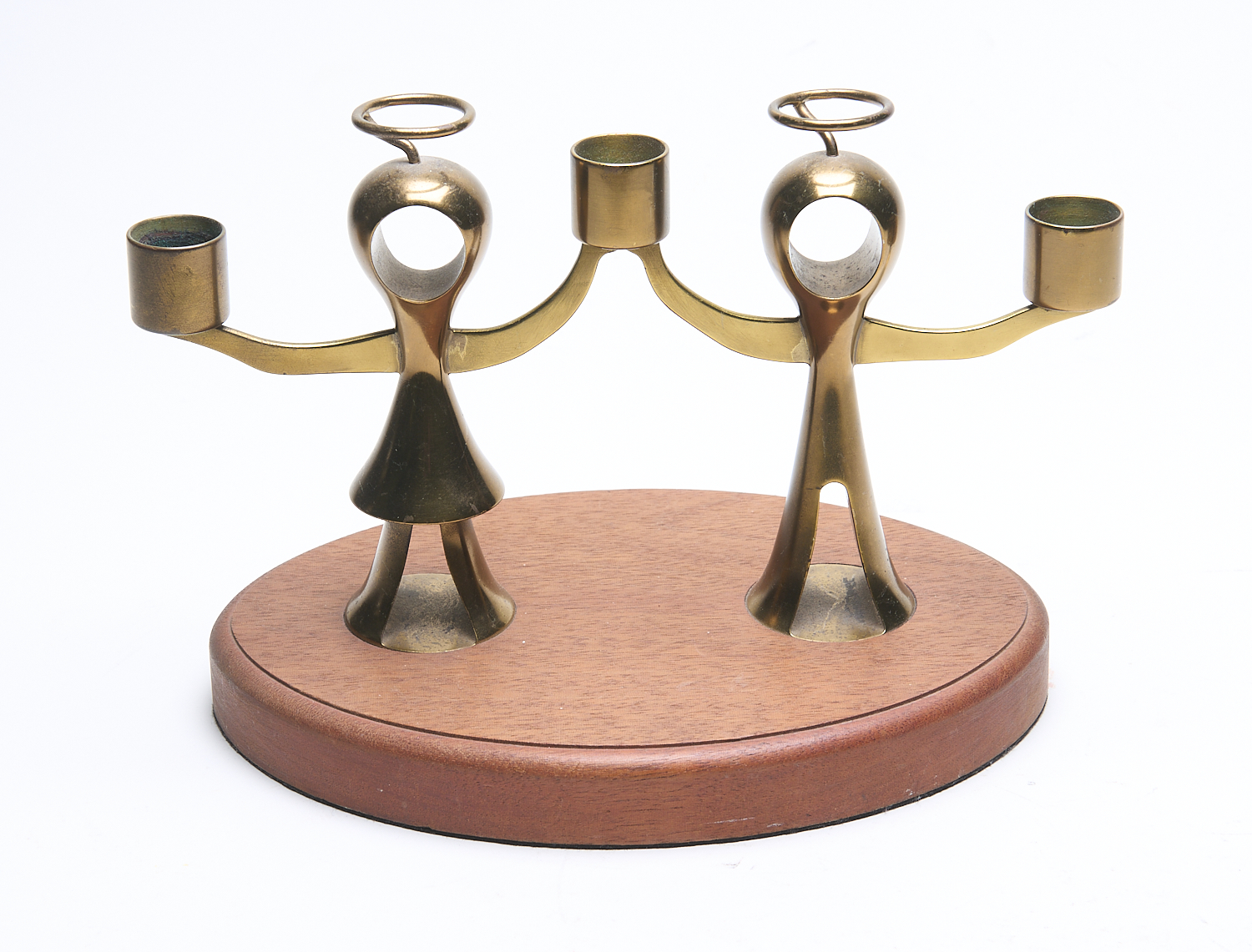 A FIGURAL BRASS CANDELABRA ON WOODEN BASE W.22CM, LEONARD JOEL LOCAL DELIVERY SIZE: SMALL