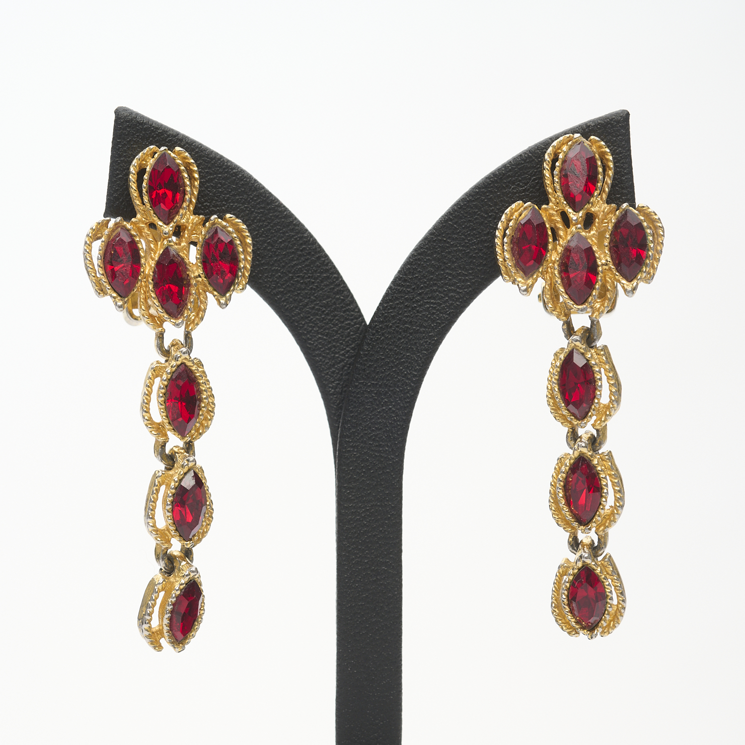 A PAIR OF VINTAGE PASTE SET CRUCIFIX EARRINGS IN GOLD PLATE, TO CLIP ON FITTINGS, DROP LENGTH 55MM