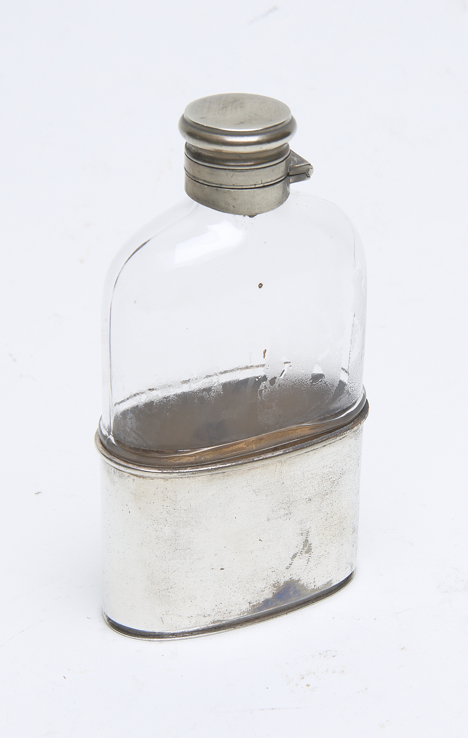 A VICTORIAN SILVERPLATE AND GLASS HIP FLASK WITH CUP AND LOCKING LID MECHANISM, H.14CM, LEONARD JOEL LOCAL DELIVERY SIZE: SMALL