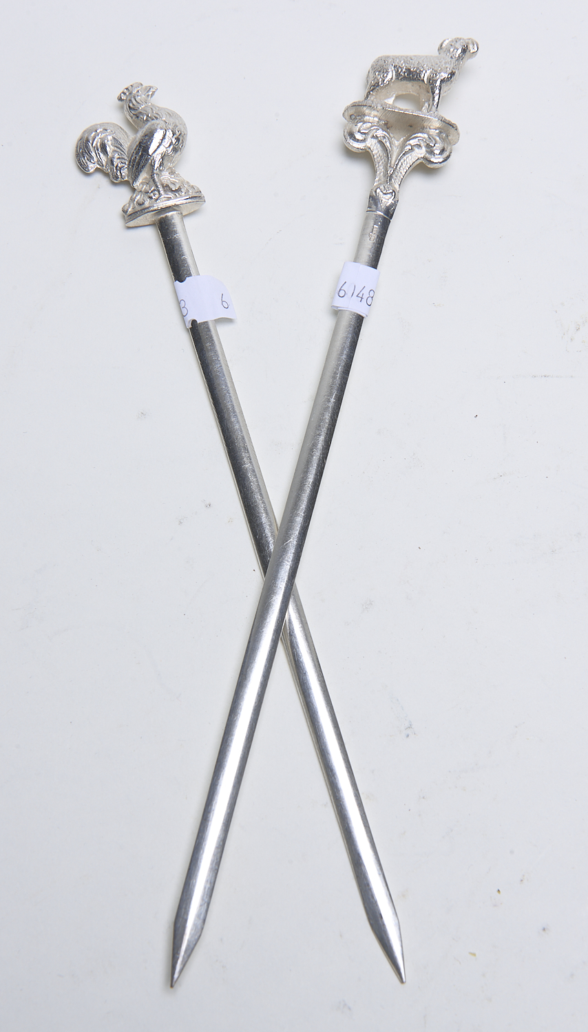 TWO SILVERPLATED SKEWERS WITH ANIMAL MOTIFS TO END H.25CM, LEONARD JOEL LOCAL DELIVERY SIZE: SMALL