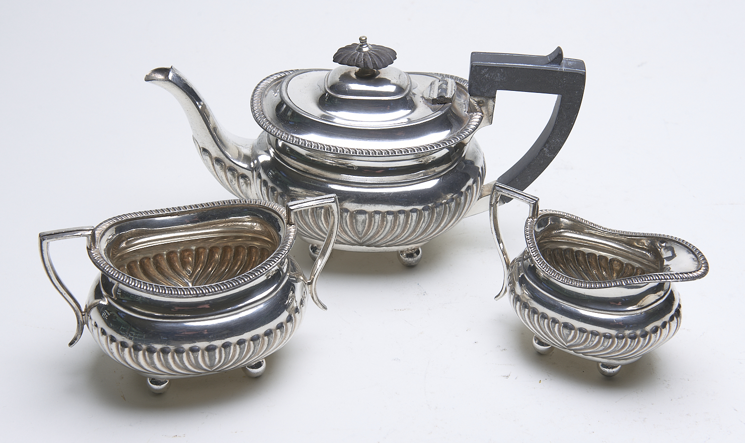 A THREE PIECE VICTORIAN SILVERPLATED TEASET WITH FLUTED DECORATION, LEONARD JOEL LOCAL DELIVERY SIZE: SMALL