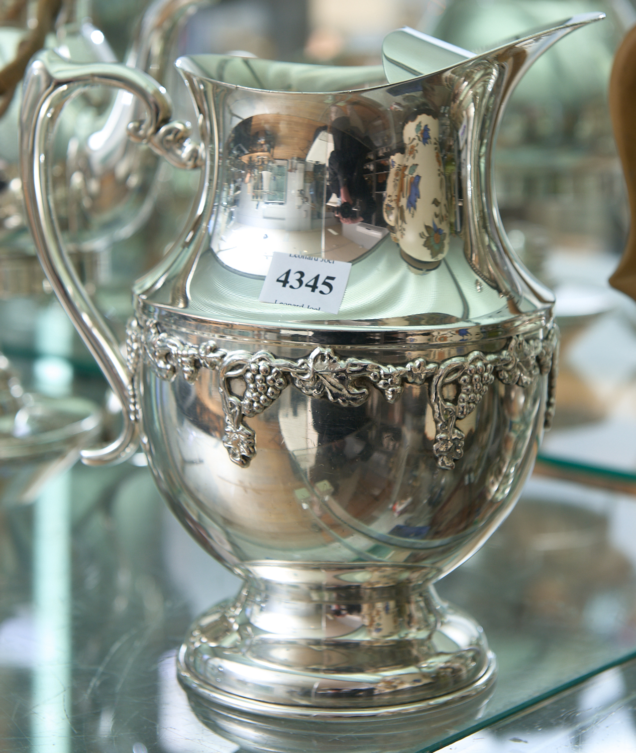 A SILVERPLATED WATER JUG WITH GRAPE PATTERNING TO SIDE H.21.5CM, LEONARD JOEL LOCAL DELIVERY SIZE: SMALL
