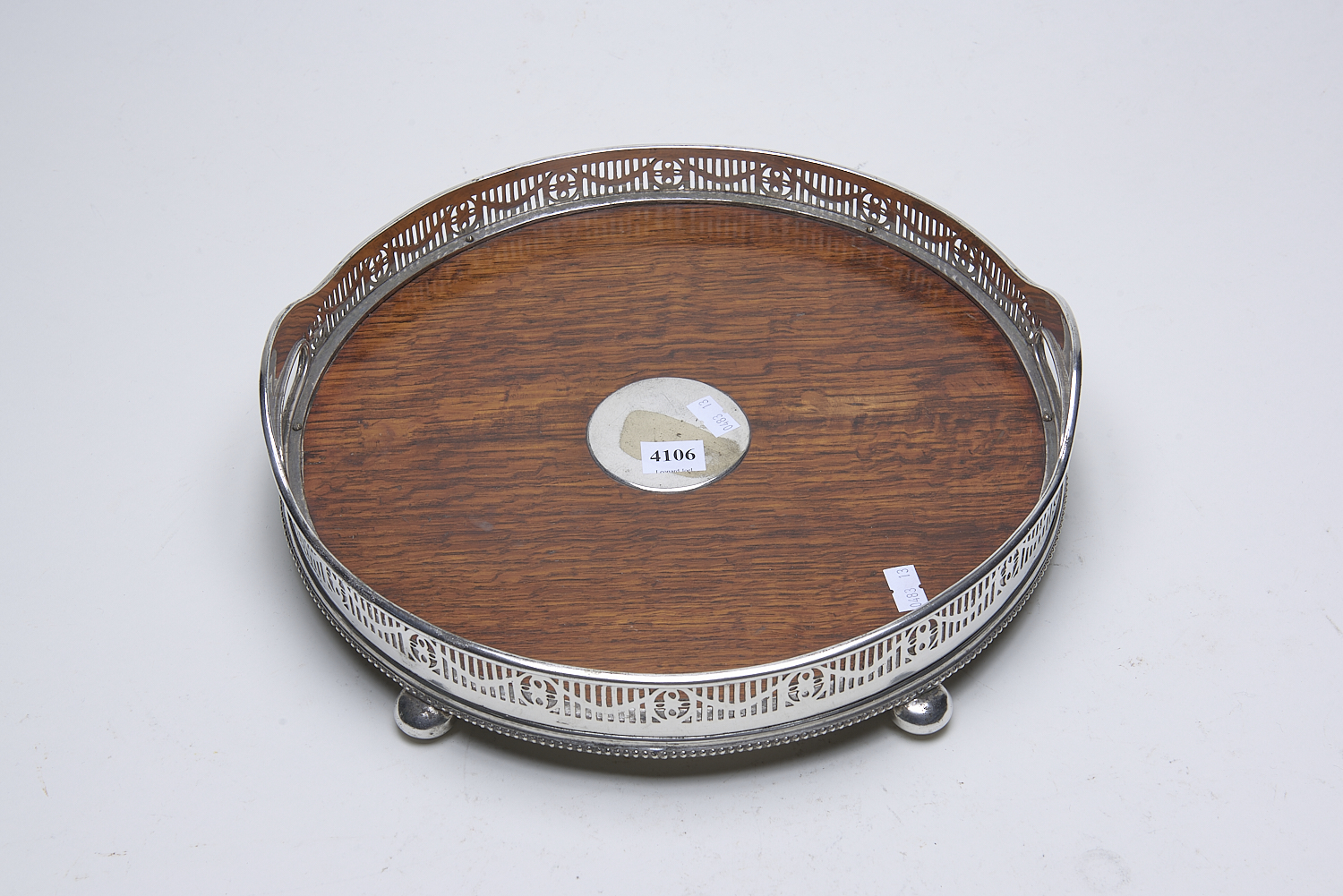 AN OAK BASED CIRCULAR GALLERY TRAY, DIA.30CM, LEONARD JOEL LOCAL DELIVERY SIZE: MEDIUM