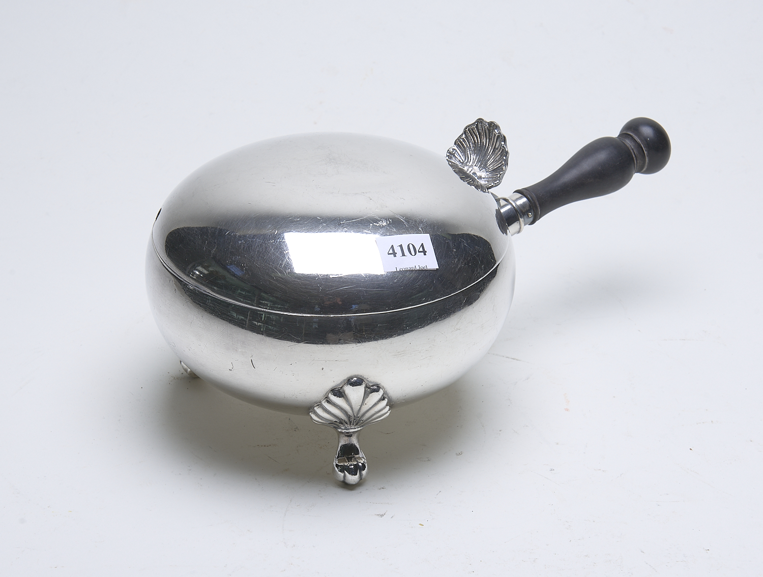 A SILVERPLATED WOODEN HANDLED SERVING BOWL WITH LID L.30CM, LEONARD JOEL LOCAL DELIVERY SIZE: SMALL